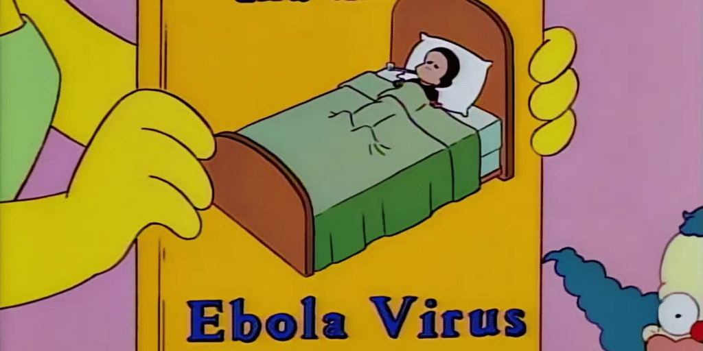In a flashback scene, young Bart lies sick in bed while Marge offers to read him a book titled “Curious George and the Ebola Virus.” At the time, the disease was relatively obscure to the public and rarely referenced outside medical journals.